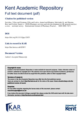 Savickas, Vilius, Foreman, Ellie, Ladva, Anmol, Bhamra, Sukvinder K., Sharma, Ravi, Corlett, Sarah A. (2020) Pharmacy services and role development in UK general practice: a cross‐sectional survey. International Journal of Pharmacy Practice, . ISSN 0961-7671. E-ISSN 2042-7174. (doi:10.1111/ijpp.12653) (KAR id:82907)