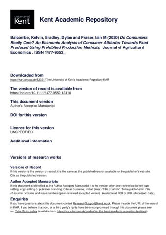 Balcombe, Kelvin, Bradley, Dylan, Fraser, Iain M (2020) Do Consumers Really Care? An Economic Analysis of Consumer Attitudes Towards Food Produced Using Prohibited Production Methods. Journal of Agricultural Economics, . ISSN 1477-9552. E-ISSN 1477-9552. (doi:10.1111/1477-9552.12410) (KAR id:83331)