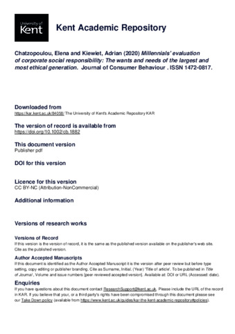 Chatzopoulou, Elena, Kiewiet, Adrian (2020) Millennials' evaluation of corporate social responsibility: The wants and needs of the largest and most ethical generation. Journal of Consumer Behaviour, . ISSN 1472-0817. (doi:10.1002/cb.1882) (KAR id:84058)