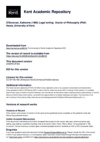O'Donovan, Katherine (1990) Legal writing. Doctor of Philosophy (PhD) thesis, University of Kent. (doi:10.22024/UniKent/01.02.86013) (KAR id:86013)