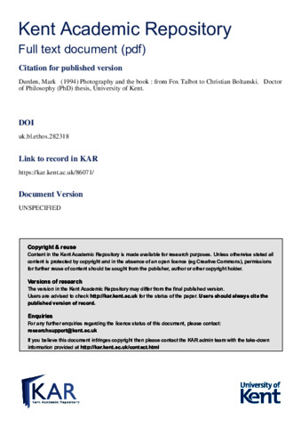 Durden, Mark (1994) Photography and the book: from Fox Talbot to Christian Boltanski. Doctor of Philosophy (PhD) thesis, University of Kent. (doi:10.22024/UniKent/01.02.86071) (KAR id:86071)