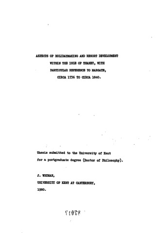 Whyman, J (1980) Aspects of holidaymaking and resort development within the Isles of Thanet, with particular reference to Margate, circa 1736 to circa 1840. Doctor of Philosophy (PhD) thesis, University of Kent. (doi:10.22024/UniKent/01.02.86086) (KAR id:86086)