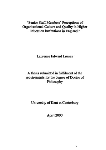 Lomas, Laurence Edward (2000) Senior staff members' perceptions of organisational culture and quality in higher education institutions in England. Doctor of Philosophy (PhD) thesis, University of Kent. (doi:10.22024/UniKent/01.02.86173) (KAR id:86173)