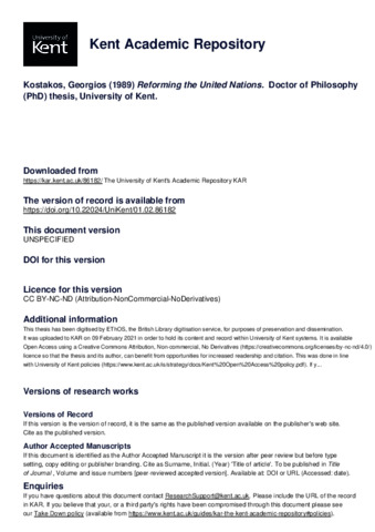 Kostakos, Georgios (1989) Reforming the United Nations. Doctor of Philosophy (PhD) thesis, University of Kent. (doi:10.22024/UniKent/01.02.86182) (KAR id:86182)