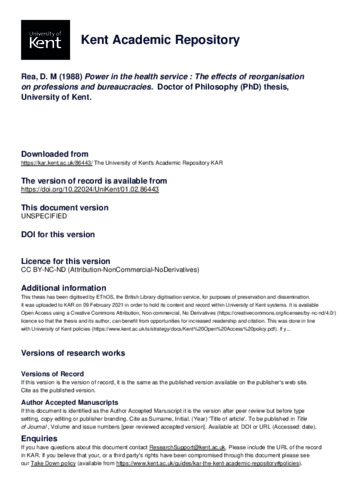 Rea, D. M (1988) Power in the health service : The effects of reorganisation on professions and bureaucracies. Doctor of Philosophy (PhD) thesis, University of Kent. (doi:10.22024/UniKent/01.02.86443) (KAR id:86443)