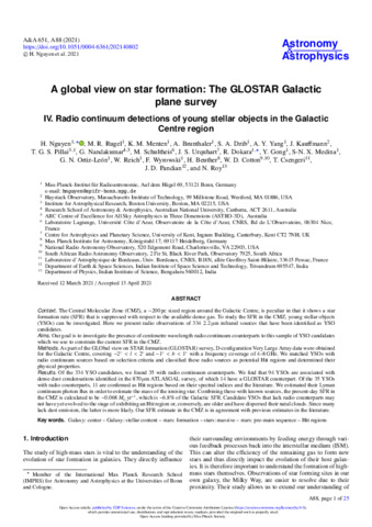 Nguyen, H., Rugel, M.R., Menten, K.M., Brunthaler, A., Dzib, S.A., Yang, A.Y., Kauffmann, J., Pillai, T., Nandakumar, G., Schultheis, M., and others. (2021) A global view on star formation: The GLOSTAR Galactic plane survey IV. Radio continuum detections of young stellar objects in the Galactic Centre region. Astronomy & Astrophysics, 651 . Article Number A88. ISSN 0004-6361. (doi:10.1051/0004-6361/202140802) (KAR id:87623)