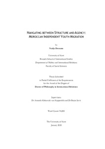 Dumann, Nadja (2021) Navigating between Structure and Agency: Moroccan Independent Youth Migration. Doctor of Philosophy (PhD) thesis, University of Kent,. (doi:10.22024/UniKent/01.02.88484) (KAR id:88484)