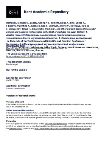 Romanov, Michael N., Laptev, Georgi Yu., Yildirim, Elena A., Ilina, Larisa A., Filippova, Valentina A., Kochish, Ivan I., Dubrovin, Andrei V., Novikova, Natalia I., Dunyashev, Timur P., Smolensky, Vladimir I., and others. (2020) [Current molecular genetic and genomic technologies in the field of studying the avian biology. 1. Applied research] Современные молекулярно-генетические и геномные технологии в области изучения биологии птиц. 1. Прикладные исследования. In: Materials of the 2nd International Scientific and Practical Conference / Материалы 2-й Международной научно-практической конференции. . pp. 13-33. Sel'skokhozyaistvennye tekhnologii / Сельскохозяйственные технологии, Moscow, Russia / Москва, Россия (doi:10.18720/SPBPU/2/k20-5) (KAR id:89219)