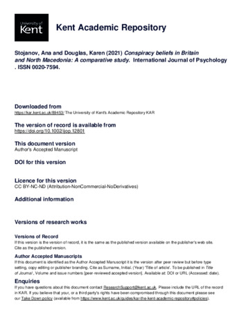 Stojanov, Ana, Douglas, Karen (2021) Conspiracy beliefs in Britain and North Macedonia: A comparative study. International Journal of Psychology, . ISSN 0020-7594. (doi:10.1002/ijop.12801) (KAR id:89453)