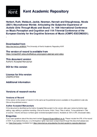 Herbert, Ruth, Walduck, Jackie, Newman, Hannah, Shaughnessy, Nicola (2021) Neurodiverse Worlds: Articulating the Subjective Experience of Autistic Girls Through Music and Sound. In: 16th International Conference on Music Perception and Cognition and 11th Triennial Conference of the European Society for the Cognitive Sciences of Music (ICMPC-ESCOM2021). . (KAR id:89824)
