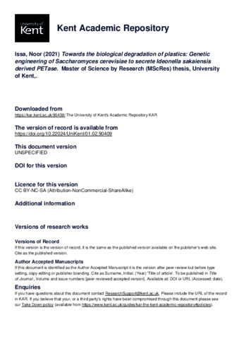 Issa, Noor (2021) Towards the biological degradation of plastics: Genetic engineering of Saccharomyces cerevisiae to secrete Ideonella sakaiensis derived PETase. Master of Science by Research (MScRes) thesis, University of Kent,. (doi:10.22024/UniKent/01.02.90409) (KAR id:90409)