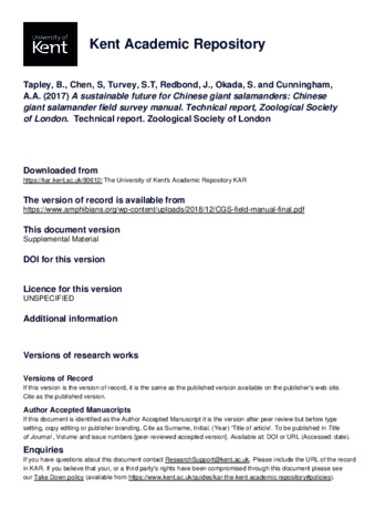 Tapley, B. and Chen, S and Turvey, S.T and Redbond, J. and Okada, S. and Cunningham, A.A. (2017) A sustainable future for Chinese giant salamanders: Chinese giant salamander field survey manual. Technical report, Zoological Society of London. Technical report. Zoological Society of London (KAR id:90612)