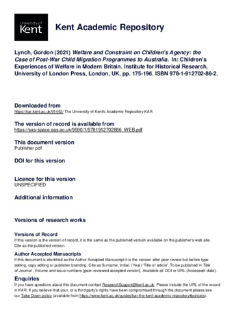 Lynch, Gordon (2021) Welfare and Constraint on Children's Agency: the Case of Post-War Child Migration Programmes to Australia. In: Children's Experiences of Welfare in Modern Britain. First edition. Institute for Historical Research, University of London Press, London, UK, pp. 175-196. ISBN 978-1-912702-86-2. E-ISBN 978-1-912702-87-9. (KAR id:91442)