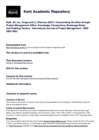 Hadi, Ali, Liu, Yange, Li, Shenxue (2021) Transcending the Silos through Project Management Office: Knowledge Transactions, Brokerage Roles, and Enabling Factors. International Journal of Project Management, . ISSN 0263-7863. (KAR id:91471)