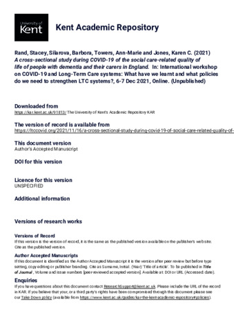 Rand, Stacey, Silarova, Barbora, Towers, Ann-Marie, Jones, Karen C. (2021) A cross-sectional study during COVID-19 of the social care-related quality of life of people with dementia and their carers in England. In: International workshop on COVID-19 and Long-Term Care systems: What have we learnt and what policies do we need to strengthen LTC systems?, 6-7 Dec 2021, Online. (Unpublished) (KAR id:91813)