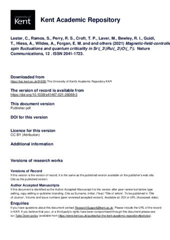 Lester, C., Ramos, S., Perry, R. S., Croft, T. P., Laver, M., Bewley, R. I., Guidi, T., Hiess, A., Wildes, A., Forgan, E. M., and others. (2021) Magnetic-field-controlled spin fluctuations and quantum criticality in Sr\(_3\)Ru\(_2\)O\(_7\). Nature Communications, 12 . Article Number 5798. ISSN 2041-1723. (doi:10.1038/s41467-021-26068-3) (KAR id:91828)
