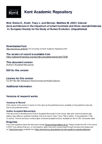 Bird, Emma E., Kivell, Tracy L., Skinner, Matthew M. (2021) Internal bone architecture in the triquetrum of extant hominids and Homo neanderthalensis. In: European Society for the Study of Human Evolution. (Unpublished) (KAR id:92553)