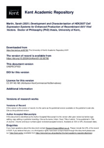 Martin, Sarah (2021) Development and Characterisation of HEK293T Cell Expression Systems for Enhanced Production of Recombinant AAV Viral Vectors. Doctor of Philosophy (PhD) thesis, University of Kent,. (doi:10.22024/UniKent/01.02.92760) (KAR id:92760)
