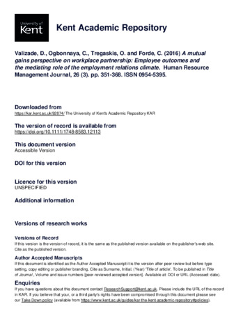 Valizade, D., Ogbonnaya, C., Tregaskis, O., Forde, C. (2016) A mutual gains perspective on workplace partnership: Employee outcomes and the mediating role of the employment relations climate. Human Resource Management Journal, 26 (3). pp. 351-368. ISSN 0954-5395. (doi:10.1111/1748-8583.12113) (KAR id:92874)