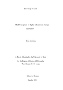 Cocking, John (2022) The Development of Higher Education in Malaya 1919-1949. Doctor of Philosophy (PhD) thesis, University of Kent,. (doi:10.22024/UniKent/01.02.93621) (KAR id:93621)