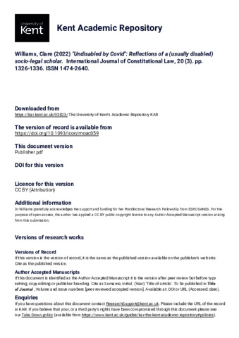 Williams, Clare (2022) "Undisabled by Covid": Reflections of a (usually disabled) socio-legal scholar. International Journal of Constitutional Law, 20 (3). pp. 1326-1336. ISSN 1474-2640. (doi:10.1093/icon/moac059) (KAR id:93823)