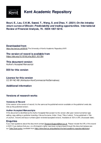 Bouri, E., Lau, C.K.M., Saeed, T., Wang, S., Zhao, Y. (2021) On the intraday return curves of Bitcoin: Predictability and trading opportunities. International Review of Financial Analysis, 76 . Article Number 101784. ISSN 1057-5219. (doi:10.1016/j.irfa.2021.101784) (KAR id:93919)