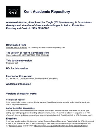 Amankwah-Amoah, Joseph, Lu, Yingfa (2022) Harnessing AI for business development: A review of drivers and challenges in Africa. Production Planning and Control, . ISSN 0953-7287. (doi:10.1080/09537287.2022.2069049) (KAR id:94058)