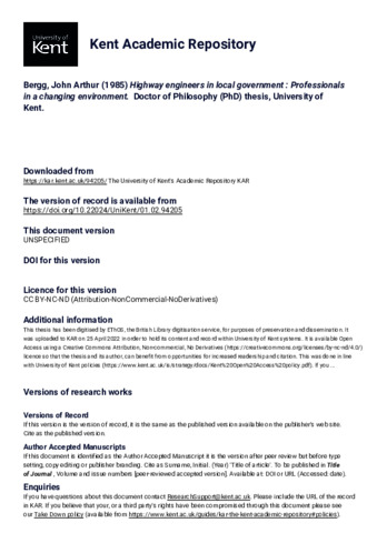 Bergg, John Arthur (1985) Highway engineers in local government : Professionals in a changing environment. Doctor of Philosophy (PhD) thesis, University of Kent. (doi:10.22024/UniKent/01.02.94205) (KAR id:94205)