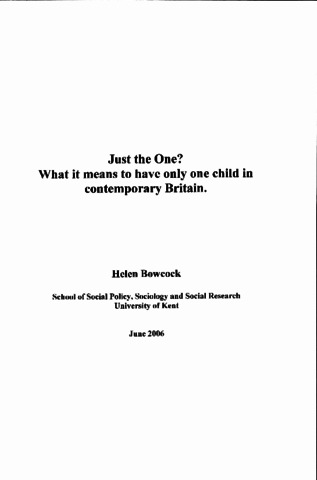 Bowcock, Helen (2006) Just the one? : what it means to have only one child in contemporary Britain. Doctor of Philosophy (PhD) thesis, University of Kent. (doi:10.22024/UniKent/01.02.94224) (KAR id:94224)