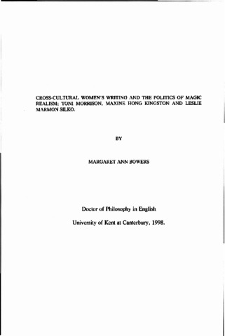 Bowers, Margaret Ann (1998) Cross-cultural women's writing and the politics of magic realism : Toni Morrison, Maxine Hong Kingston and Leslie Marmon Silko. Doctor of Philosophy (PhD) thesis, University of Kent. (doi:10.22024/UniKent/01.02.94226) (KAR id:94226)