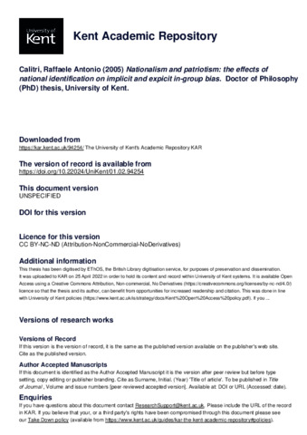 Calitri, Raffaele Antonio (2005) Nationalism and patriotism: the effects of national identification on implicit and expicit in-group bias. Doctor of Philosophy (PhD) thesis, University of Kent. (doi:10.22024/UniKent/01.02.94254) (KAR id:94254)