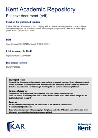 Calnan, Michael Warrender (1981) Coping with accidents and emergencies : a study of how the community uses the hospital accident and emergency department. Doctor of Philosophy (PhD) thesis, University of Kent. (doi:10.22024/UniKent/01.02.94255) (KAR id:94255)