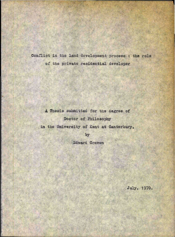 Craven, Edward (1970) Conflict in the land development process : The role of the private residential developer. Doctor of Philosophy (PhD) thesis, University of Kent. (doi:10.22024/UniKent/01.02.94288) (KAR id:94288)