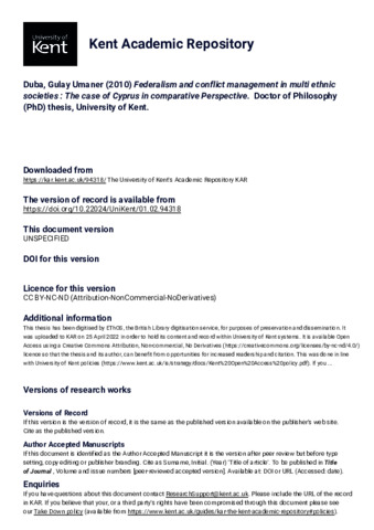 Duba, Gulay Umaner (2010) Federalism and conflict management in multi ethnic societies : The case of Cyprus in comparative Perspective. Doctor of Philosophy (PhD) thesis, University of Kent. (doi:10.22024/UniKent/01.02.94318) (KAR id:94318)