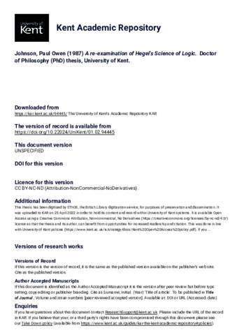 Johnson, Paul Owen (1987) A re-examination of Hegel's Science of Logic. Doctor of Philosophy (PhD) thesis, University of Kent. (doi:10.22024/UniKent/01.02.94445) (KAR id:94445)