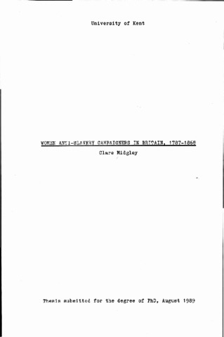 Midgely, Clare (1989) Women anti-slavery campaigners in Britain, 1787-1868. Doctor of Philosophy (PhD) thesis, University of Kent. (doi:10.22024/UniKent/01.02.94527) (KAR id:94527)