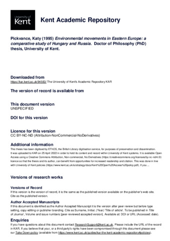 Pickvance, Katy (1995) Environmental movements in Eastern Europe: a comparative study of Hungary and Russia. Doctor of Philosophy (PhD) thesis, University of Kent. (doi:10.22024/UniKent/01.02.94583) (KAR id:94583)