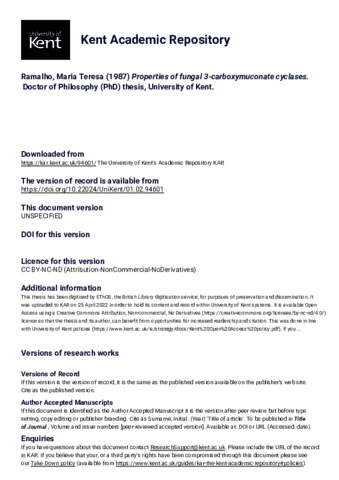 Ramalho, Maria Teresa (1987) Properties of fungal 3-carboxymuconate cyclases. Doctor of Philosophy (PhD) thesis, University of Kent. (doi:10.22024/UniKent/01.02.94601) (KAR id:94601)