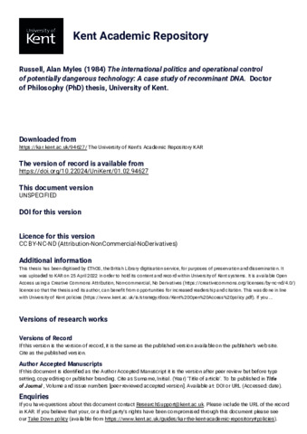 Russell, Alan Myles (1984) The international politics and operational control of potentially dangerous technology: A case study of reconminant DNA. Doctor of Philosophy (PhD) thesis, University of Kent. (doi:10.22024/UniKent/01.02.94627) (KAR id:94627)