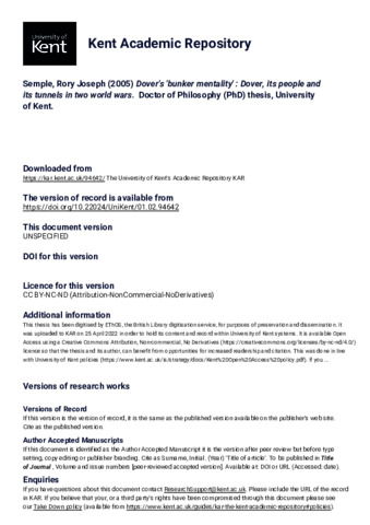 Semple, Rory Joseph (2005) Dover's 'bunker mentality' : Dover, its people and its tunnels in two world wars. Doctor of Philosophy (PhD) thesis, University of Kent. (doi:10.22024/UniKent/01.02.94642) (KAR id:94642)