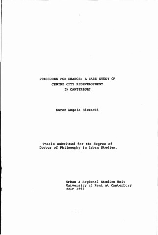 Sieracki, Karen Angela (1983) Pressures for change : A case study of centre city redevelopment in Canterbury. Doctor of Philosophy (PhD) thesis, University of Kent. (doi:10.22024/UniKent/01.02.94649) (KAR id:94649)
