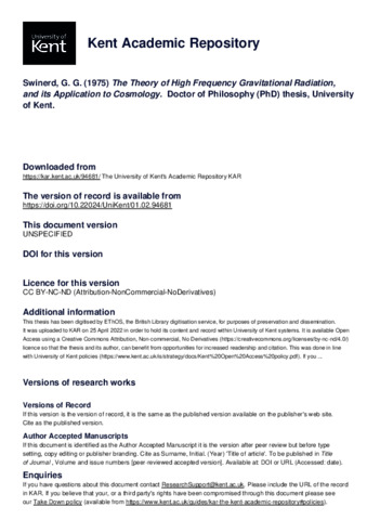 Swinerd, G. G. (1975) The Theory of High Frequency Gravitational Radiation, and its Application to Cosmology. Doctor of Philosophy (PhD) thesis, University of Kent. (doi:10.22024/UniKent/01.02.94681) (KAR id:94681)