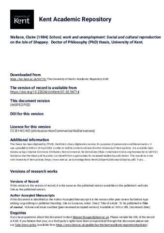 Wallace, Claire (1984) School, work and unemployment: Social and cultural reproduction on the Isle of Sheppey. Doctor of Philosophy (PhD) thesis, University of Kent. (doi:10.22024/UniKent/01.02.94714) (KAR id:94714)