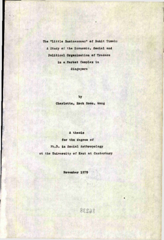 Wong, Charlotte Hock Soon (1979) The 'little businessman' of Bukit Timah: A study of the economic, social and political organization of traders in a market complex in Singapore. Doctor of Philosophy (PhD) thesis, University of Kent. (doi:10.22024/UniKent/01.02.94733) (KAR id:94733)