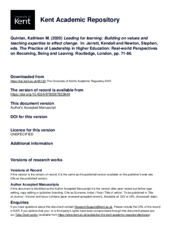 Quinlan, Kathleen M. (2020) Leading for learning: Building on values and teaching expertise to effect change. In: Jarrett, Kendall and Newton, Stephen, eds. The Practice of Leadership in Higher Education: Real-world Perspectives on Becoming, Being and Leaving. First edition. Routledge, London, pp. 71-86. E-ISBN 978-0-367-82384-9. (doi:10.4324/9780367823849) (KAR id:95132)