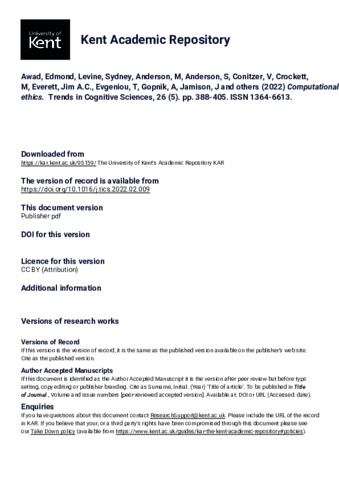 Awad, Edmond, Levine, Sydney, Anderson, M, Anderson, S, Conitzer, V, Crockett, M, Everett, Jim A.C., Evgeniou, T, Gopnik, A, Jamison, J, and others. (2022) Computational ethics. Trends in Cognitive Sciences, 26 (5). pp. 388-405. ISSN 1364-6613. (doi:10.1016/j.tics.2022.02.009) (KAR id:95159)