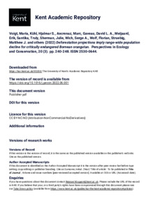 Voigt, Maria, Kühl, Hjalmar S., Ancrenaz, Marc, Gaveau, David L. A., Meijaard, Erik, Santika, Truly, Sherman, Julie, Wich, Serge A., Wolf, Florian, Struebig, Matthew J., and others. (2022) Deforestation projections imply range-wide population decline for critically endangered Bornean orangutan. Perspectives in Ecology and Conservation, 20 (3). pp. 240-248. ISSN 2530-0644. (doi:10.1016/j.pecon.2022.06.001) (KAR id:95350)