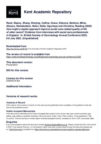 Rand, Stacey, Zhang, Wenjing, Collins, Grace, Silarova, Barbora, Milne, Alisoun, Ramsbottom, Helen, Della, Ogunleye, Christina, Reading (2022) How might a dyadic approach improve social care-related quality of life of older carers? Evidence from interviews with social care professionals in England. In: British Society of Gerontology Annual Conference 2022, 6-8 July 2022. (Unpublished) (KAR id:95750)