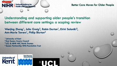 Zhang, Wenjing, Greig, Julia, Darton, Robin, Saloniki, Eirini-Christina, Towers, Ann-Marie, Blurton, Philip (2022) Understanding and supporting older people’s moves into and between social care settings: a scoping review. In: British Society of Gerontology Annual Conference 2022, 6-8 July 2022. (Unpublished) (KAR id:95752)