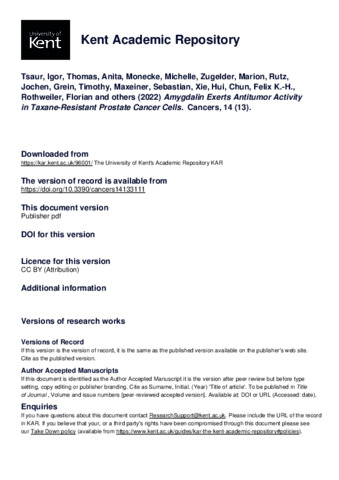 Tsaur, Igor, Thomas, Anita, Monecke, Michelle, Zugelder, Marion, Rutz, Jochen, Grein, Timothy, Maxeiner, Sebastian, Xie, Hui, Chun, Felix K.-H., Rothweiler, Florian, and others. (2022) Amygdalin Exerts Antitumor Activity in Taxane-Resistant Prostate Cancer Cells. Cancers, 14 (13). Article Number 3111. E-ISSN 2072-6694. (doi:10.3390/cancers14133111) (KAR id:96001)